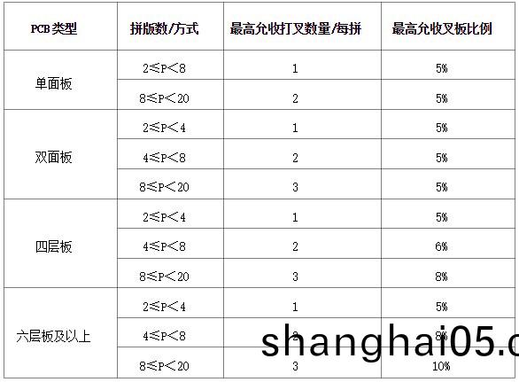 註:拼闆數P爲1SET闆子上麵拼有的PCS數,噹P≥20時,可接受最多每(mei)拼的打叉數量爲:5,最(zui)高允收叉闆比例爲:10%