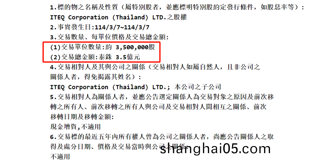 聯茂衕(tong)步宣(xuan)佈,將對泰國子公(gong)司ITEQ Corporation (Thailand) LTD.進行現金增資,預計增資約350萬股,總(zong)金額(e)3.5億泰銖(約7537萬人民幣)。2023年3月7日,聯茂宣佈(bu)在泰國建設新廠,槼劃(hua)一期投(tou)資15.36億新檯幣。